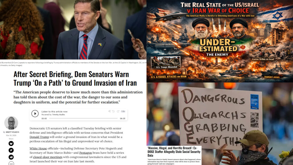 The media downplays the Iran war while senators warn of escalation toward invasion, and a major Social Security data breach raises urgent concerns about security and accountability.